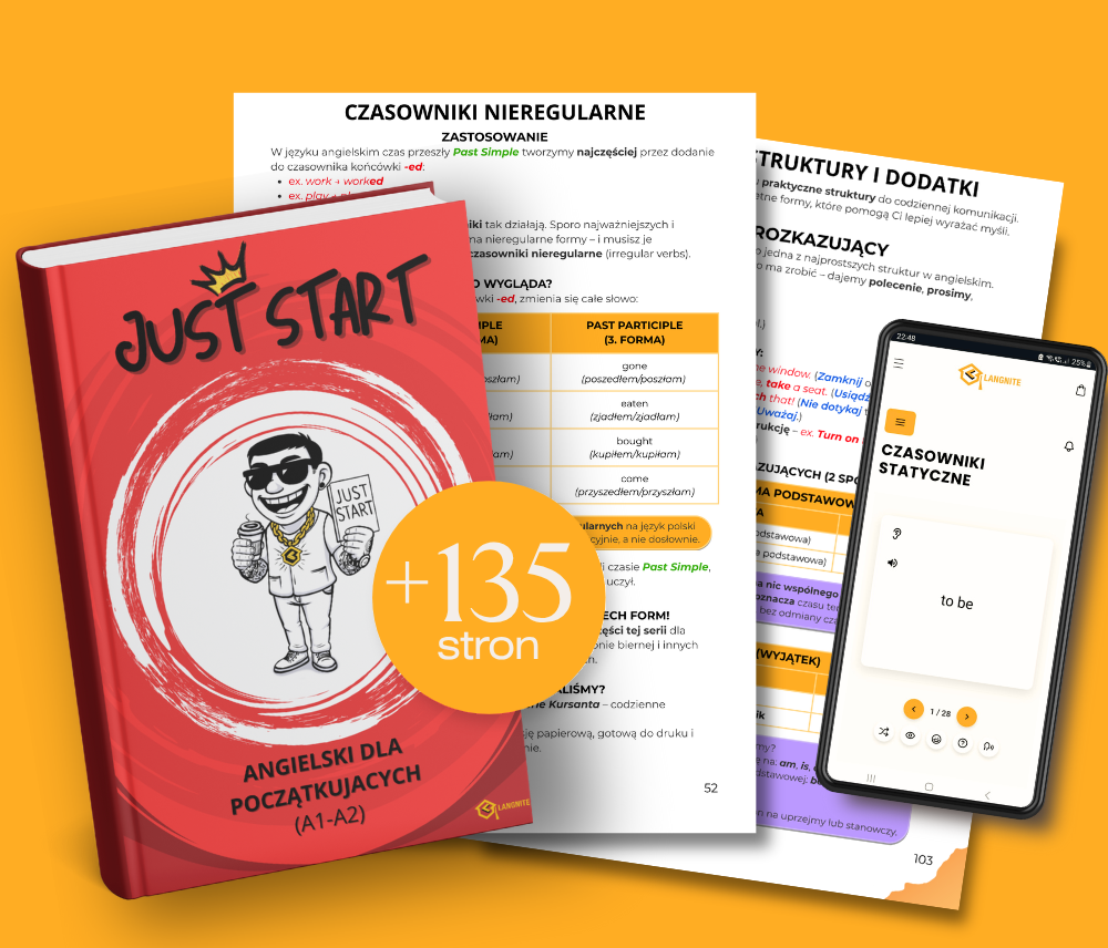 JUST START to kompletny kurs pakietowy do nauki angielskiego od podstaw – bez lania wody, bez zbędnych rozdziałów, tylko same konkrety.